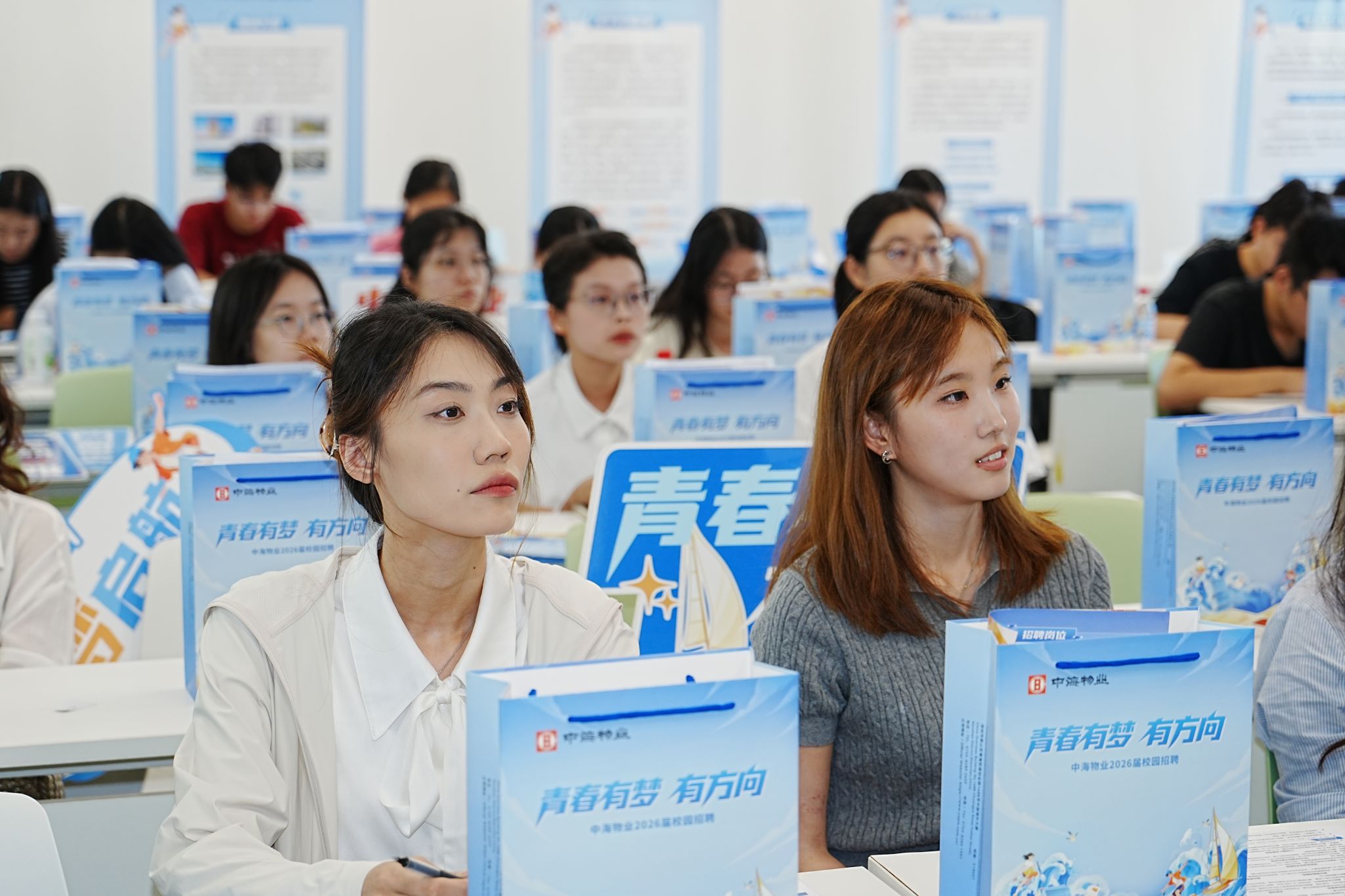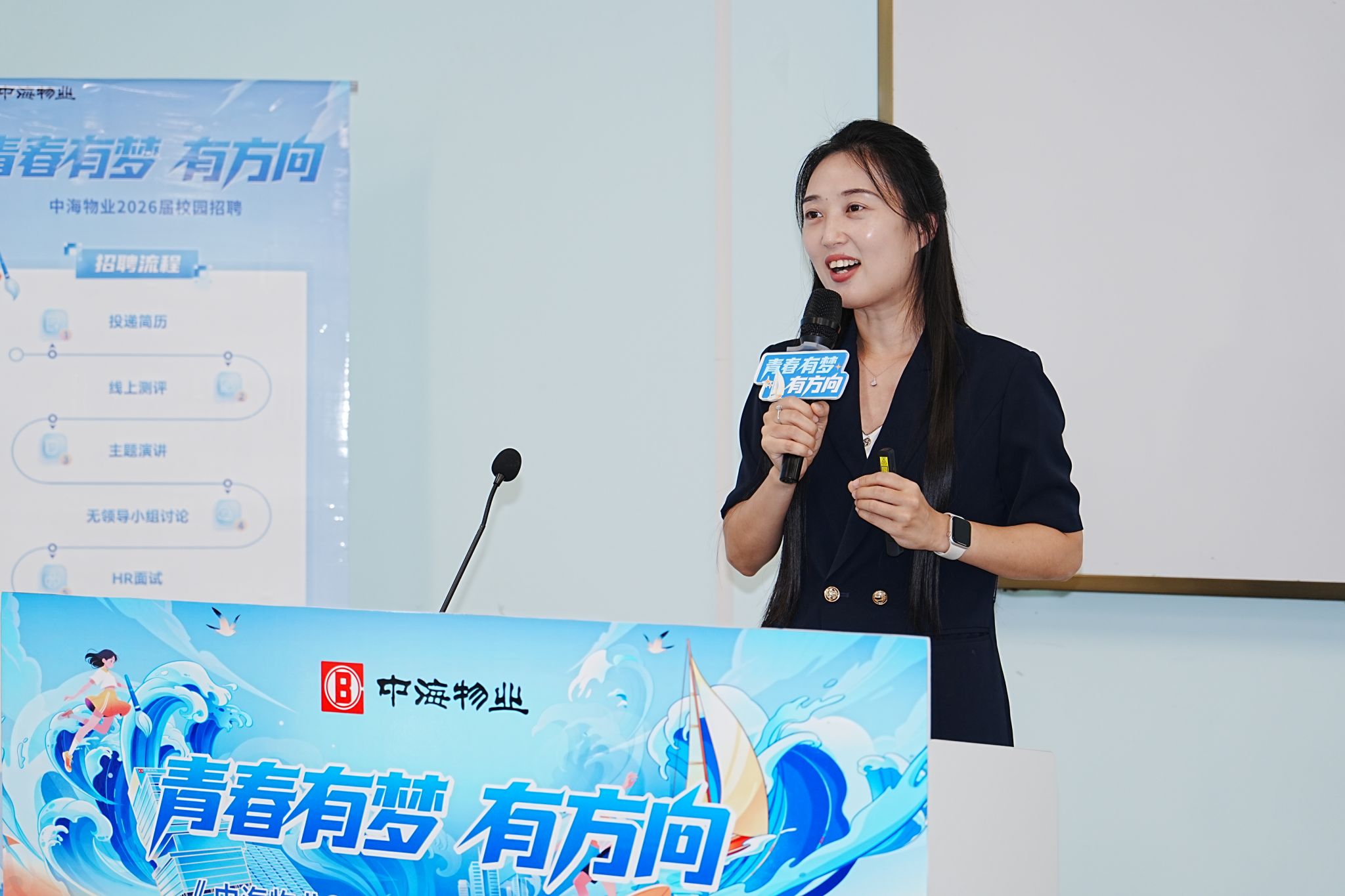 中海物业集团人力资源部副总经理何承围绕企业发展历程、管培生培养体系及校企合作成果作了专题分享。她回顾了中海物业自1986年创立以来的发展历程,重点介绍了作为“首批在港上市的物业央企”的品牌实力与多元业态布局。人事行政部经理奚萌指出,中海物业高度重视青年人才的系统化培养,构建了“选、育、用、留”全周期管培体系,并通过“管培生先锋队”“高潜训练营”等项目助力青年快速成长。任建兴总经理指出树立正确的择业观,是迈向成功职业生涯的第一步。同学们应主动认清自身的兴趣与优势,勇于在多元化的岗位中寻找适合自己的舞台,更要不怕吃苦,唯有在实践中经风雨、见世面,才能增长才干,最终成就一番事业。